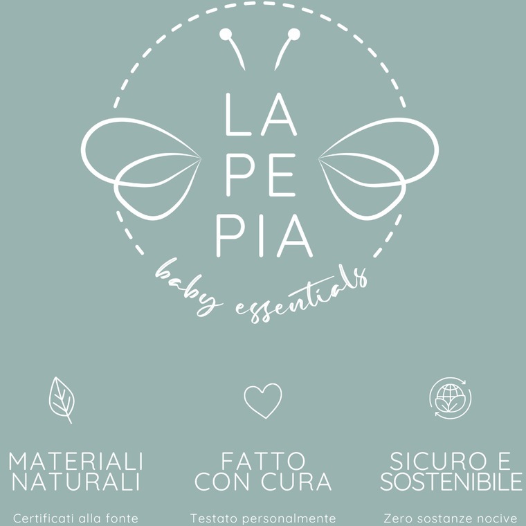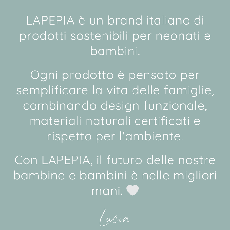Sono Lucia e ho creato LAPEPIA per offrire prodotti sostenibili per neonati e bambini, pensati per accompagnare l’infanzia con dolcezza, stile e rispetto per il mondo che li accoglie.